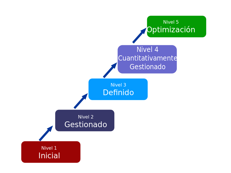 This displays a diagram that illustrates the different levels of CMMI (Capability Maturity Model Integration). There are five distinct levels, each with its own color and label. These levels include: Nivel 1 - Inicial, Nivel 2 - Definitivo, Nivel 3 - Establecido, Nivel 4 - Optimizado, and Nivel 5 - Maturado. The diagram is organized in a linear fashion, with each level building upon the previous one to achieve higher levels of performance and efficiency within an organization. This visual representation helps to convey the progression that organizations can expect when implementing CMMI practices.