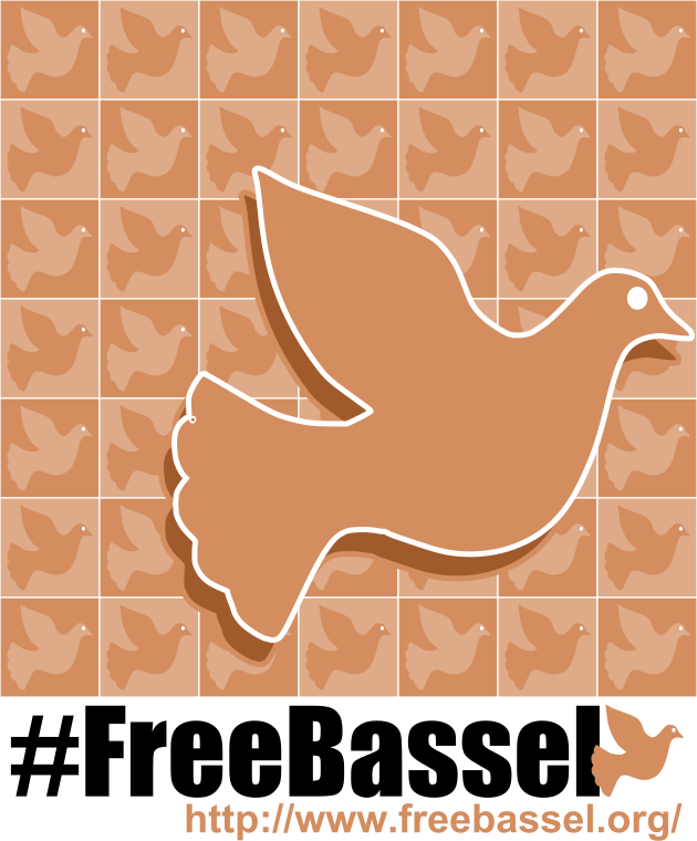 This features a brown dove flying towards the right, with its wings spread out. The dove is surrounded by a pattern of small doves on the background, creating an interesting visual effect. In the foreground, there is a bird logo that says "FreeBassel" in honor of Bassel Khartabil. This unique design showcases support and solidarity towards the cause.