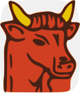 This features a cartoon bull with large horns, giving it an angry appearance. It is the main focus of the image and appears to be the only animal depicted in the scene. The bull's face is prominently displayed, showcasing its distinctive features such as its eyes, nose, mouth, and ears. Its red color adds a vibrant touch to the overall design of the image.