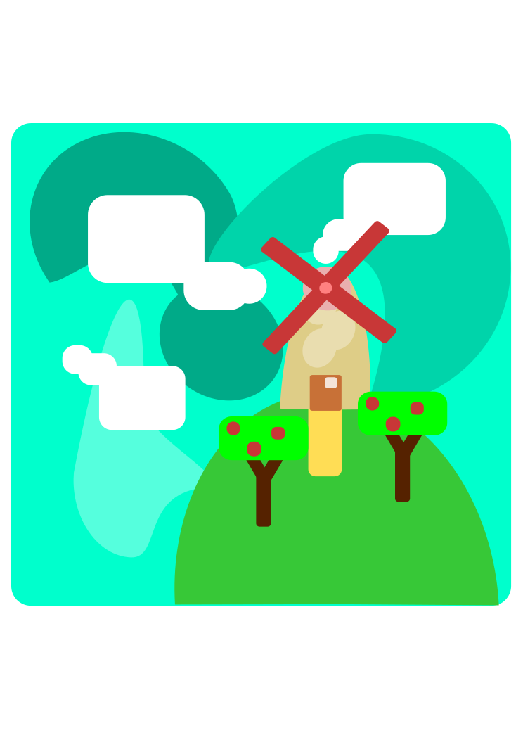 This features a colorful and whimsical scene of a windmill with a red cross on top, surrounded by trees. The windmill is situated in the middle of a lush green field, giving it an idyllic appearance. There are several trees surrounding the windmill, some closer to the foreground while others extend further into the background. The overall composition creates a sense of harmony between nature and human-made structures.