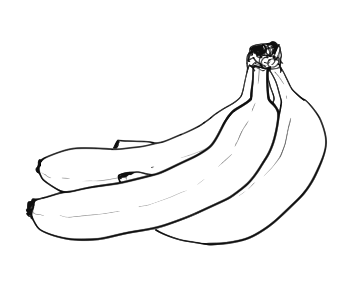This features a drawing of two bananas, one on top of the other. They are depicted in black and white, giving them an artistic appearance. The bananas are placed against a light-colored background that contrasts with their darker tones. This simple yet elegant drawing captures the essence of the banana fruit, showcasing its shape and texture through the use of line art.