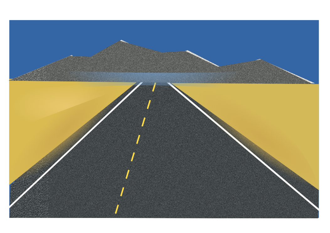 This is a digital artwork of an empty road with a yellow line down the middle. The road appears to be in a desert-like environment, giving it a sense of openness and vastness. In the background, there are mountains visible, adding to the scenic beauty of the landscape. The overall composition of the image is visually appealing and captures the essence of traveling on an empty highway with breathtaking views in the distance.