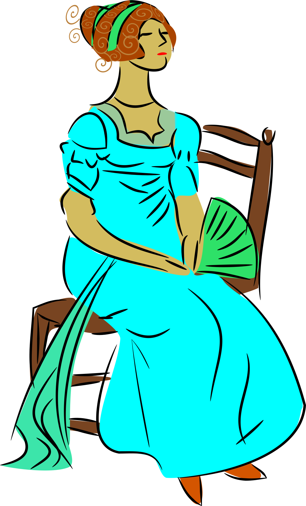 This features a woman dressed in a blue gown, sitting on a wooden chair. She appears to be holding an umbrella and is wearing a headband. The woman's attire suggests that she might be from the 18th century or a historical period. The chair she sits on has a simple design with no additional decorations. Overall, the scene captures a moment of relaxation for the woman as she enjoys her time in this setting.
