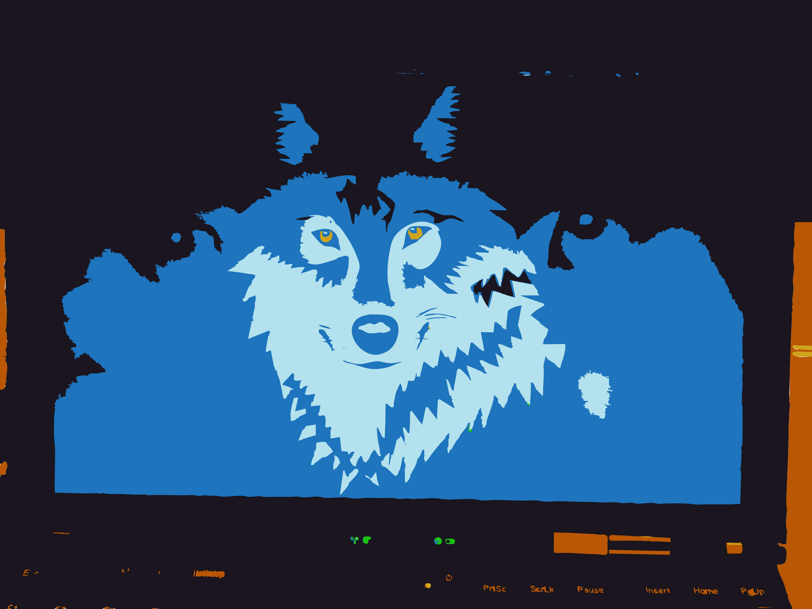 This features a blue wolf with yellow eyes, which is the main focus of the picture. It appears to be an artistic representation or a cartoon-like drawing of a wolf. The background consists of a combination of black and blue colors, creating a contrasting effect against the wolf's vibrant blue hue. This unique image captures the viewer's attention with its unconventional color scheme and artistic style.