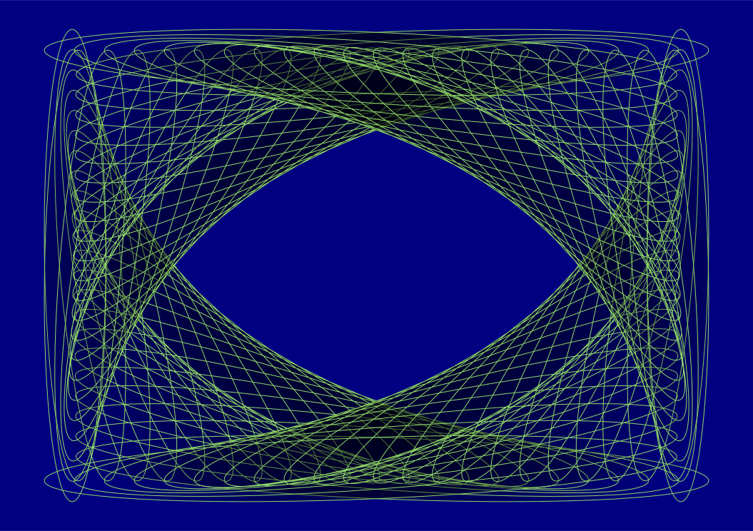 This features a blue background with an intricate design of interconnected lines and shapes. These lines are arranged in a circular pattern, creating a visually appealing and complex structure. The overall composition gives the impression of a three-dimensional space, as if one is looking through a window into another world. The colors used in this artwork are predominantly blue, which adds to the depth and atmosphere of the scene.