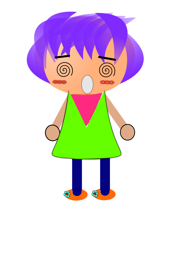 This features a cartoon character with purple hair and a green shirt. This character is standing in front of a white background, giving the impression that it's an illustration or drawing. The character appears to be wearing a necklace around its neck, adding to its unique appearance. The overall scene has a playful and whimsical vibe, with the cartoon figure being the main focus of the image.