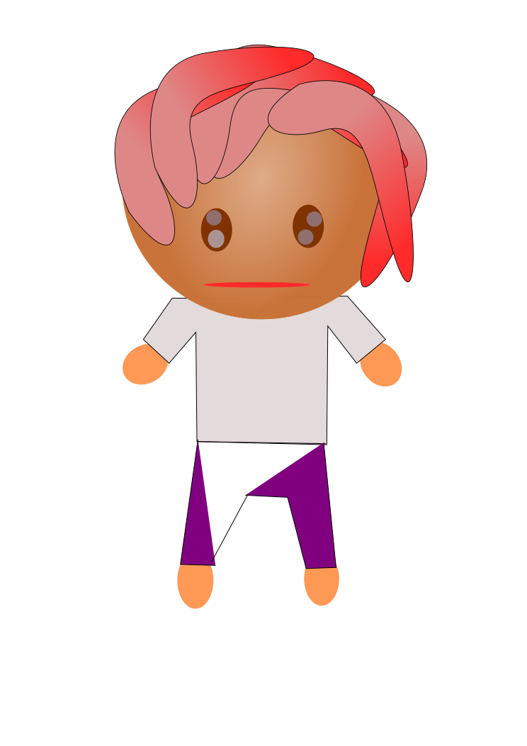 This features a cartoon character with red hair and a pink shirt. This character is standing in the center of the frame, posing for the camera. The character appears to be wearing purple pants, adding a unique touch to its outfit. The overall composition of the image gives off a playful and whimsical vibe, as it showcases this cartoon figure in an artistic manner.