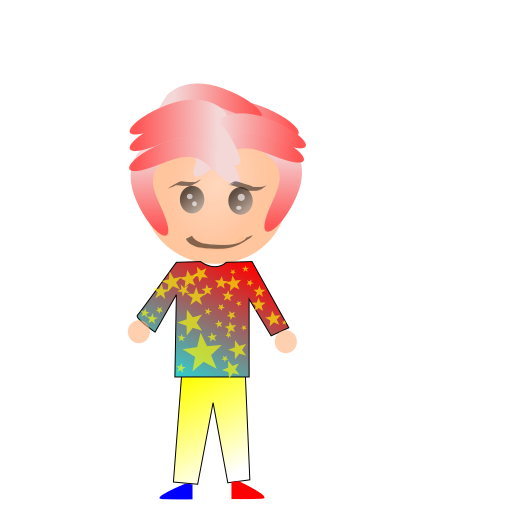 This features a cartoon character with red hair and a blue shirt. The character is wearing yellow pants, giving it an interesting appearance. It appears to be standing in front of a white background, which provides a clean and uncluttered look for the image. The overall effect is that of a simple yet engaging illustration.