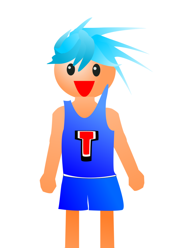 This features a cartoon character wearing a blue and white sports outfit. The character is standing with their arms at their sides, giving the impression of being in motion or ready for action. The outfit includes a blue shirt with a large T on it, as well as shorts that are also blue. The overall appearance of the cartoon character gives off a sense of energy and excitement, likely representing an athlete or someone engaged in physical activity.