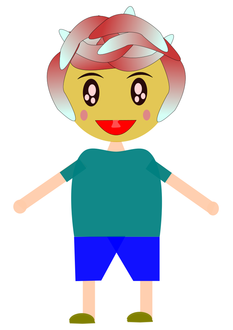 This features a cartoon character with a green shirt and blue shorts. This character has a unique appearance, as it is drawn in a style that resembles a manga or anime style. The character's facial expression appears to be somewhat sad, giving the impression of being lonely. The character is posed against a white background, which helps to emphasize its features and make it stand out from the rest of the image.