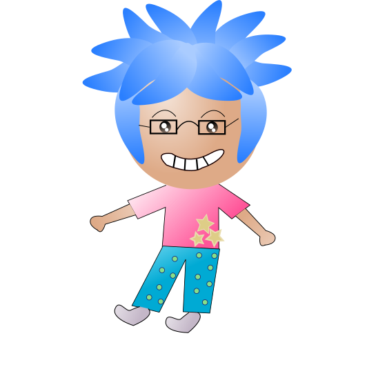 This features a cartoon character with blue hair and glasses, wearing pink clothing. The character is standing in the air, giving off an impression of being happy or excited. The character's outfit includes polka dot pants, which adds to its playful appearance. The overall scene has a fun and lively atmosphere, as it showcases this unique and colorful cartoon figure.