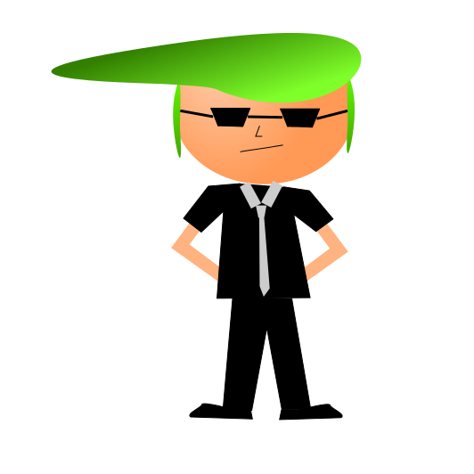 This features a cartoon character with green hair and sunglasses, wearing a black shirt. This unique individual is standing in the center of the frame, posing for the camera. The character's outfit includes a tie, which adds to its distinctive appearance. The overall style of the character suggests that it could be from an animated show or comic book.