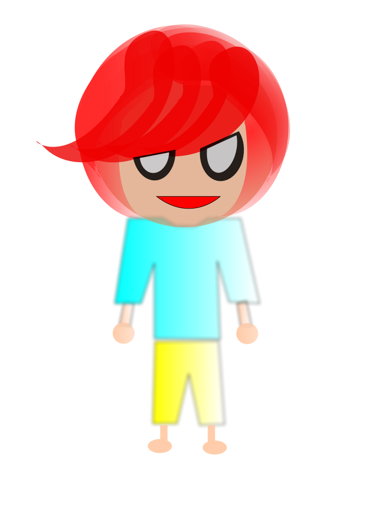 This features a cartoon character with red hair and a blue shirt. This character is standing in front of a brown wall, giving the impression that they are posing for a picture. The cartoon figure appears to be wearing yellow shorts, adding a touch of color to the scene. Overall, it's an interesting and playful image with a unique style.