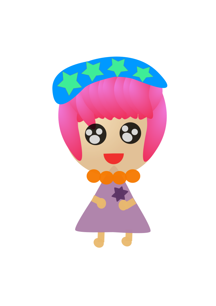 This features a cartoon character with pink hair and a blue hat. She is wearing a purple dress, giving her an adorable appearance. The character has a big smile on her face, adding to the cheerful atmosphere of the scene. The overall composition of the image creates a sense of fun and playfulness.