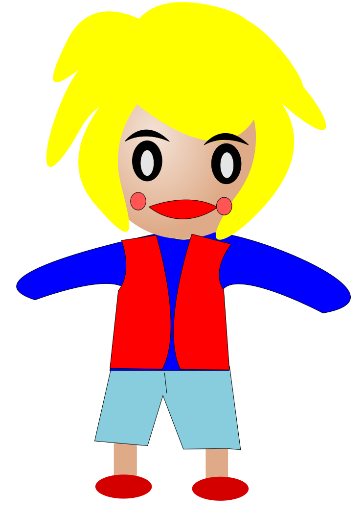 This features a cartoon character with blonde hair, wearing a red vest and blue shorts. The character appears to be a young boy or girl, possibly a child's avatar. The character is standing in front of a white background, which provides a clean and uncluttered backdrop for the image. The design of the cartoon character suggests that it could be part of an animated show or video game, where such characters are commonly used to engage viewers and create a sense of fun and adventure.