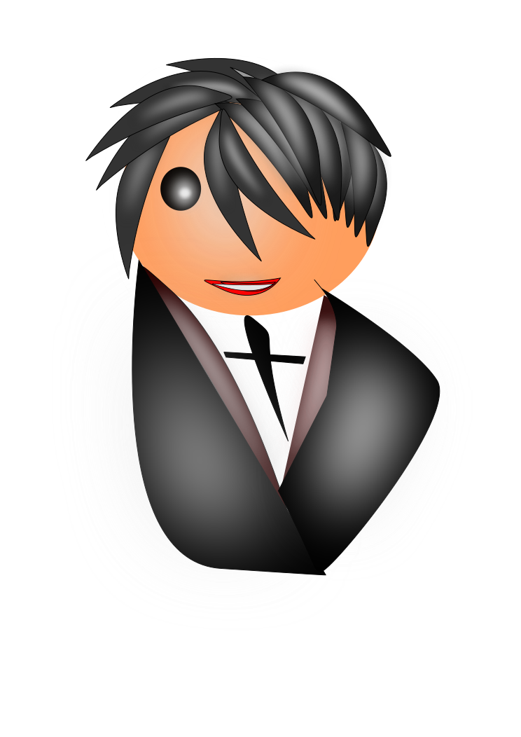 This features a cartoon character with black hair and a black suit. This character is wearing a tie, which adds to the overall formal appearance of the drawing. The character appears to be smiling as it poses for the picture. The background of the image is a light brown color, providing a contrasting backdrop for the main subject. Overall, this cartoon figure exudes a sense of confidence and style.