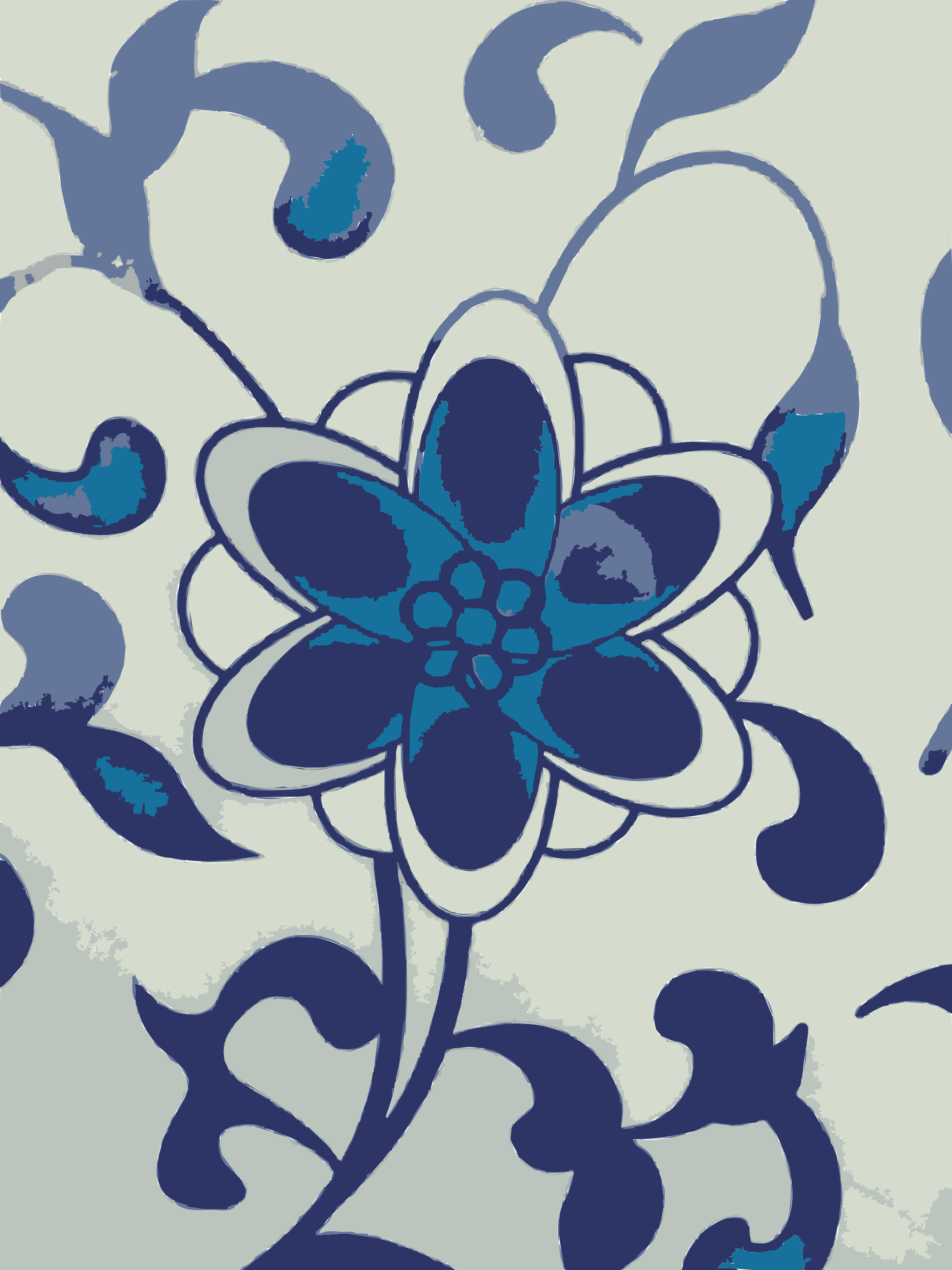 This features a blue flower with a white center, surrounded by a pattern of leaves. The flower is the main focus of the scene and stands out against the background. The leaves surrounding the flower are also in shades of blue, creating a cohesive color scheme throughout the design. This artistic piece showcases the beauty of nature through its vibrant colors and intricate patterns.