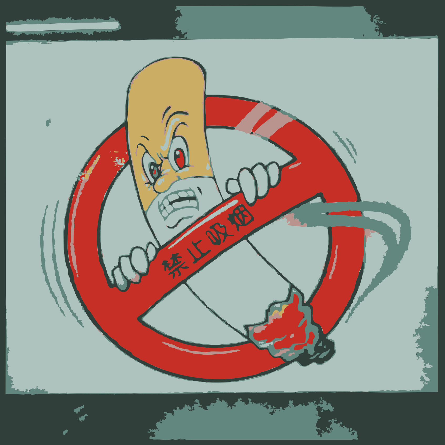 This features a cartoon character, possibly a man or a clown, holding up a red circle with an angry expression on its face. Behind the circle, there is a lit cigar, which adds to the angry appearance of the character. The character seems to be defying the "No Smoking" sign by lighting and smoking the cigar. This creative representation of the concept can evoke humor or provoke thought about the consequences of smoking in public spaces.