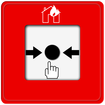 This features a red fire alarm button with two black arrows pointing towards it. This button is likely used to activate an emergency response system, such as alerting the local fire department in case of a fire or other hazardous situations. The design of the button and its placement on a red background suggests that it is meant to be easily identifiable and accessible for use during emergencies.