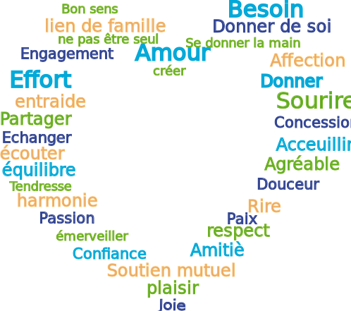 This features a heart made out of various words, with each word being displayed in different colors and sizes. These words are arranged to form the shape of a heart, showcasing the creativity behind this unique display. The heart is filled with love-related words such as "amour," "affection," "donne," and "souci." Additionally, there are other words like "bien," "equilibre," "respect," and "plaisir" that contribute to the overall theme of the heart. The combination of these words creates a visually appealing and thought-provoking display.