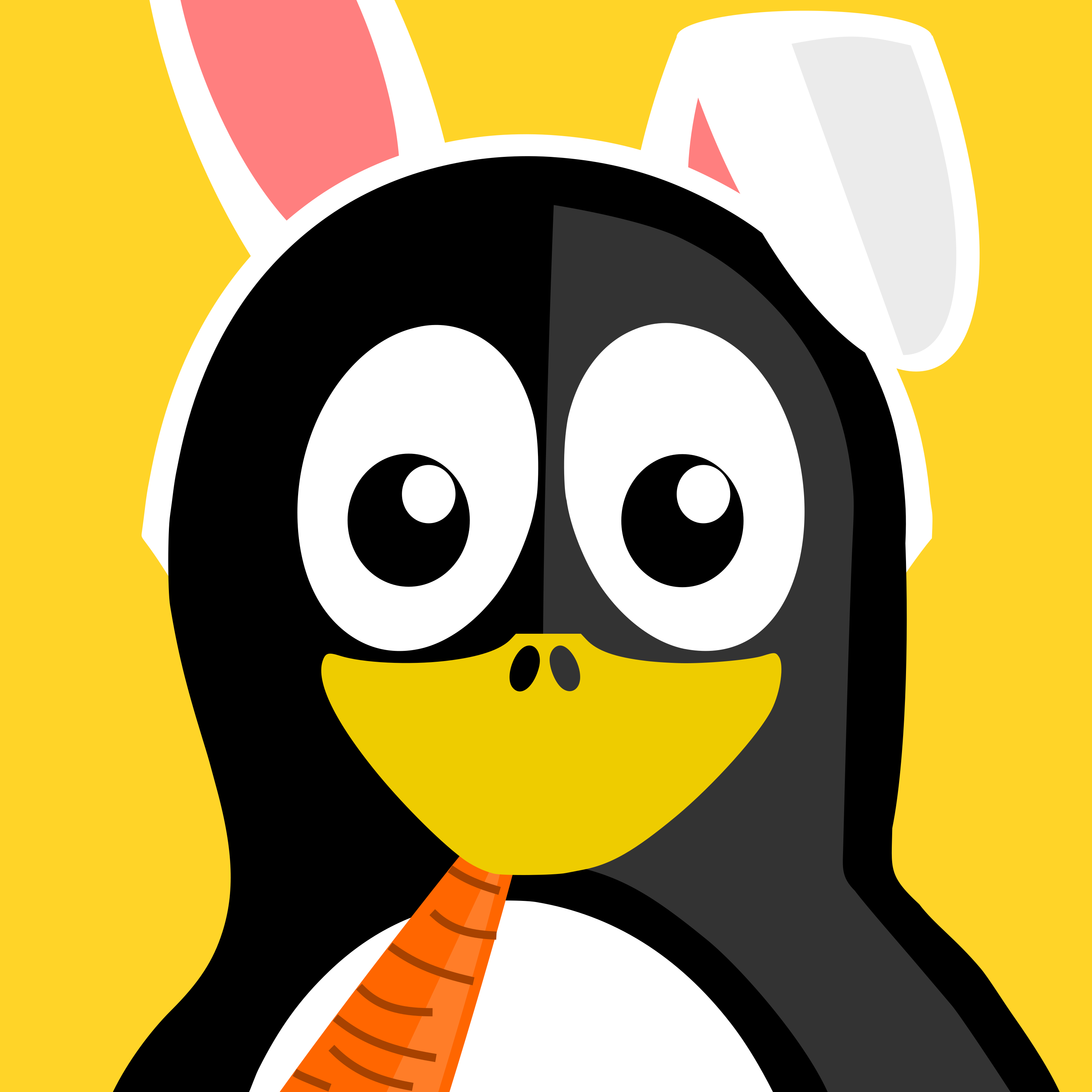 This features a cute cartoon penguin with big eyes and a carrot in its mouth. It is wearing a pair of white rabbit ears on top of its head, giving it a unique appearance. The penguin's body is predominantly black and white, while the rabbit ears are colored yellow. The penguin appears to be smiling as it poses for the camera with the carrot in its mouth. This whimsical character could be used in various contexts such as children's books or educational materials, where it can serve as a fun and engaging mascot.