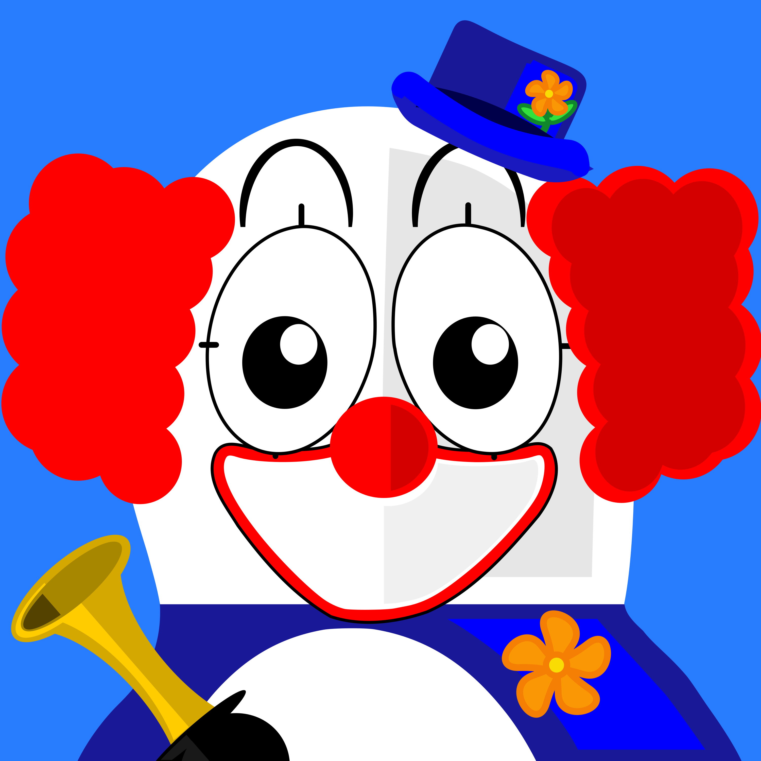 This features a clown with red hair and a blue hat, holding a trumpet. The clown is wearing a suit and has a big smile on his face. He appears to be the main focus of the scene, occupying most of the frame. The clown's outfit and accessories give him a playful and entertaining appearance, making him an ideal mascot for various events or performances.