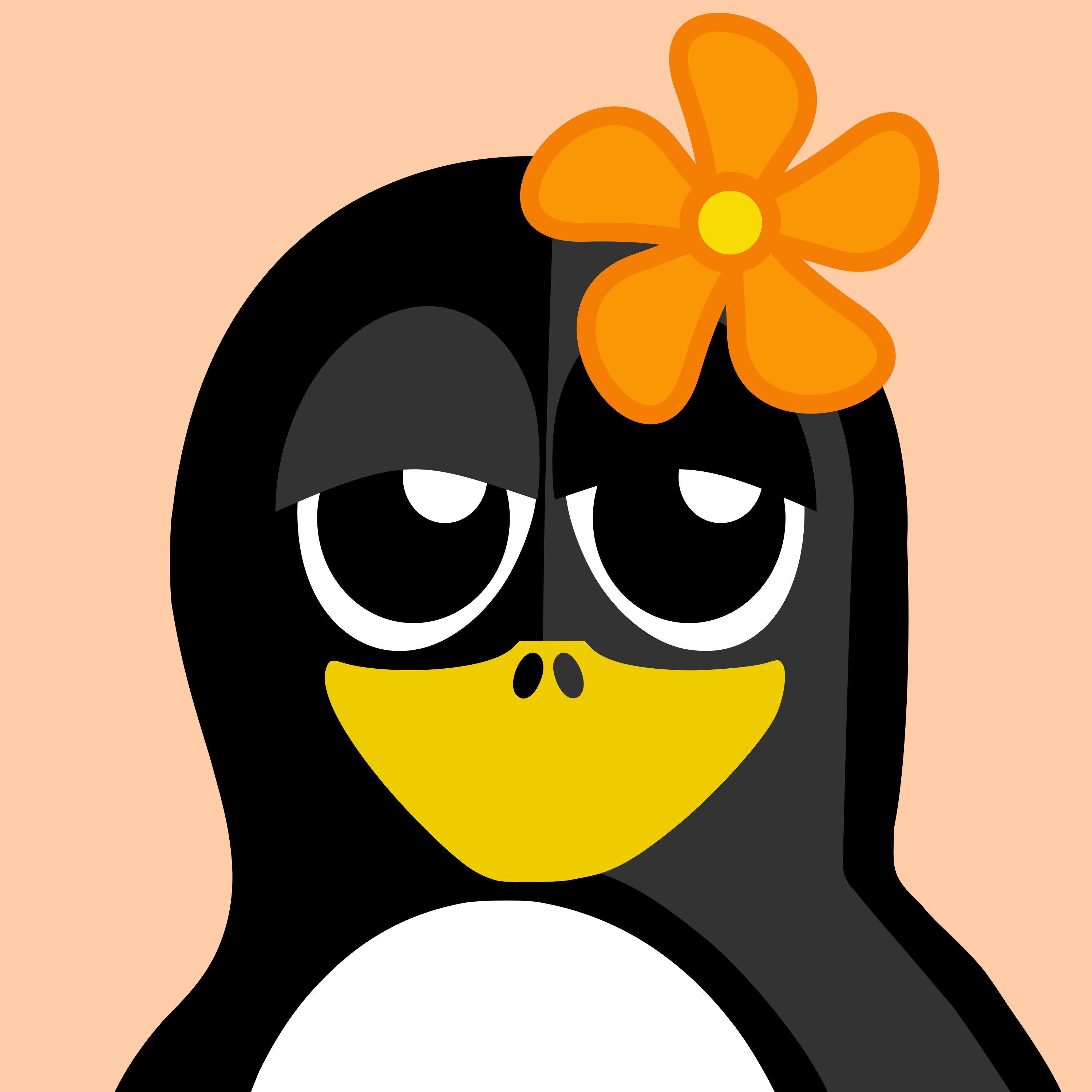 This features a cute penguin with an orange flower on its head. It has a yellow beak and is wearing a black and white suit. The penguin appears to be smiling, giving the impression of being happy or playful. This cartoon-like illustration showcases the penguin's unique features in a fun and engaging manner.