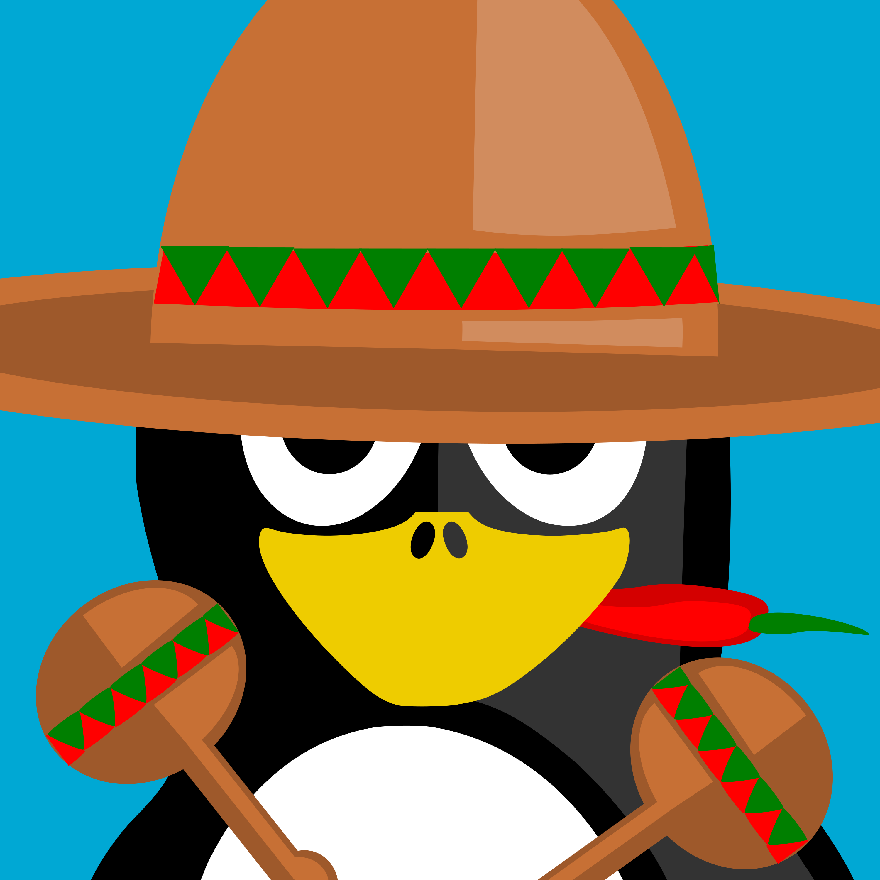 This features a cute cartoon penguin wearing a sombrero hat, holding two maracas in its hands. The penguin is standing on a blue background, which adds to the overall colorful and playful atmosphere of the scene. The penguin's facial expression appears to be somewhat angry or displeased, adding an element of humor to the image. Overall, it's a fun and lighthearted illustration that showcases the penguin in a unique and entertaining way.