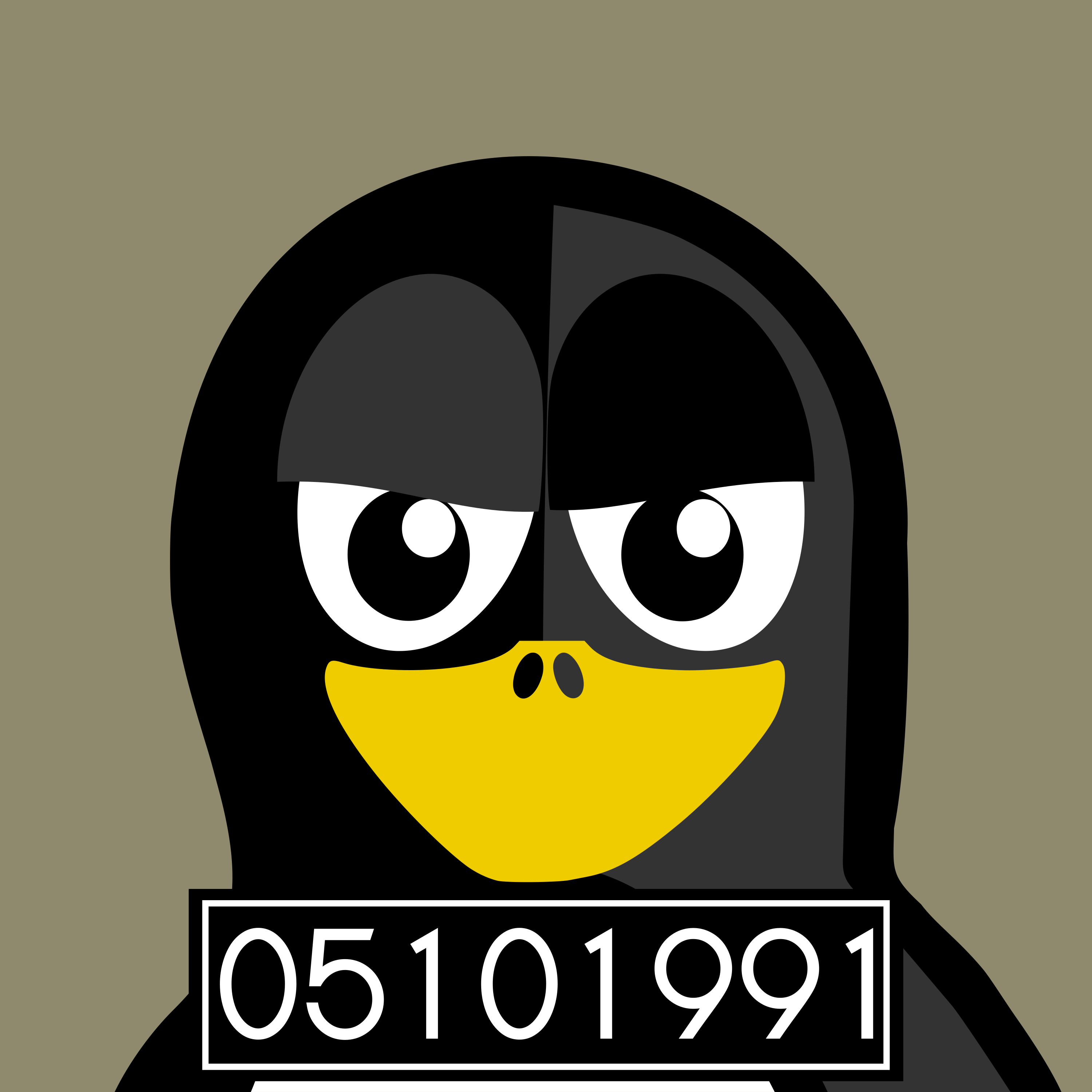 This features a black and white penguin with a yellow beak, which is holding its mugshot number. The penguin's eyes are closed, giving it an innocent appearance. The mugshot number displayed in the image is 5191991. This unique design of a penguin holding its mugshot number creates a playful and creative visual representation of law enforcement.