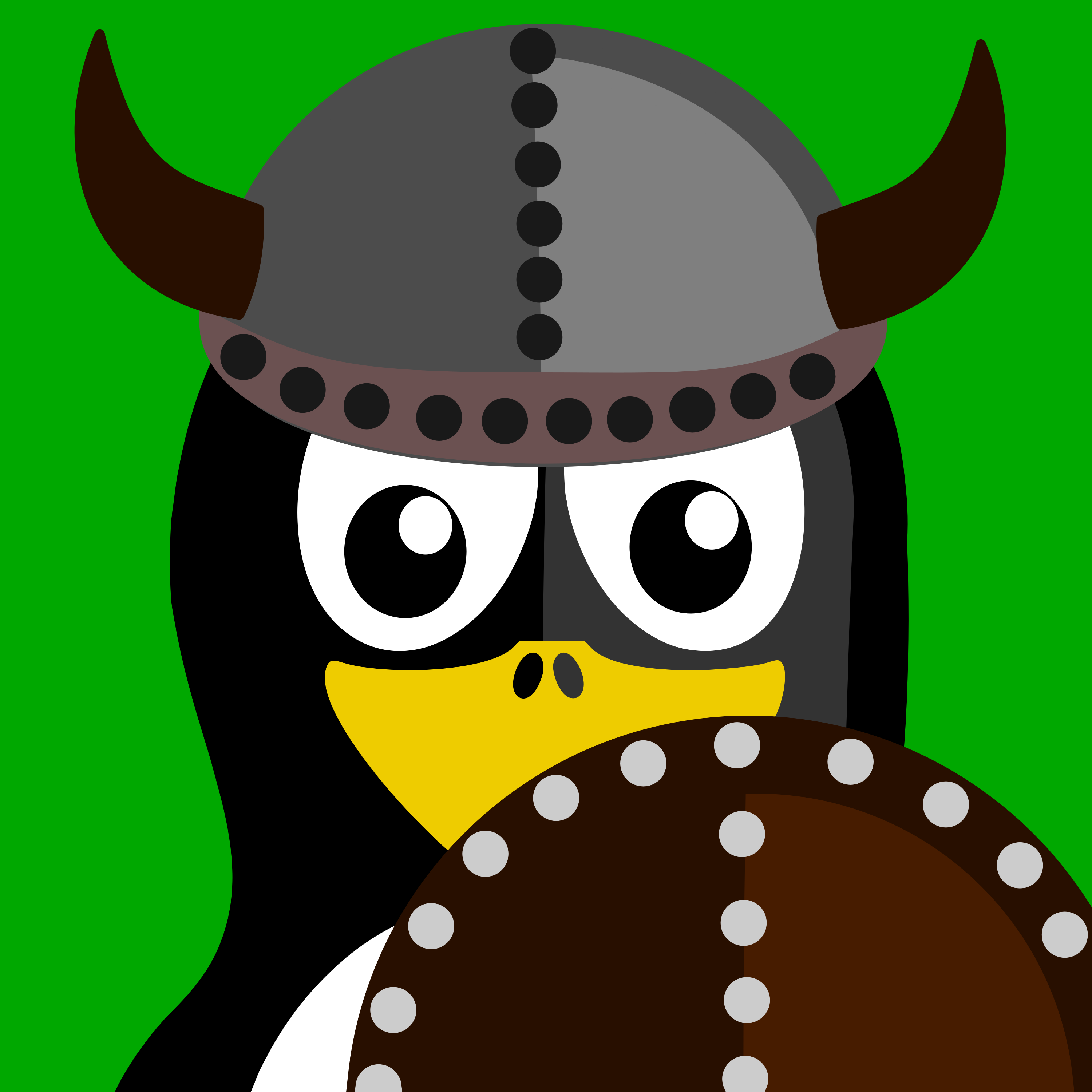 This features a cute cartoon penguin dressed in medieval armor, including a helmet and shield. The penguin is holding the shield up to its face, giving it an amusing appearance. The scene appears to be set on a green background, which adds to the overall colorfulness of the image. This creative portrayal of a penguin as a knight or viking showcases the playful and imaginative nature of the cartoon character.