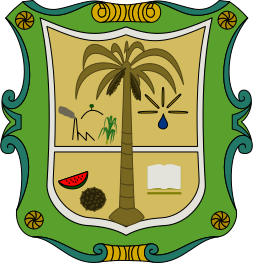 This features a green and gold shield with various symbols on it. In the center of the shield, there is an illustration of a palm tree, which appears to be the main focus of the design. Surrounding the palm tree are several other images, including a book, a watermelon, a pineapple, and a bowl. The shield also has a clock on it, adding more detail to the overall design. The combination of these symbols creates an interesting and visually appealing emblem that likely represents something significant or meaningful.