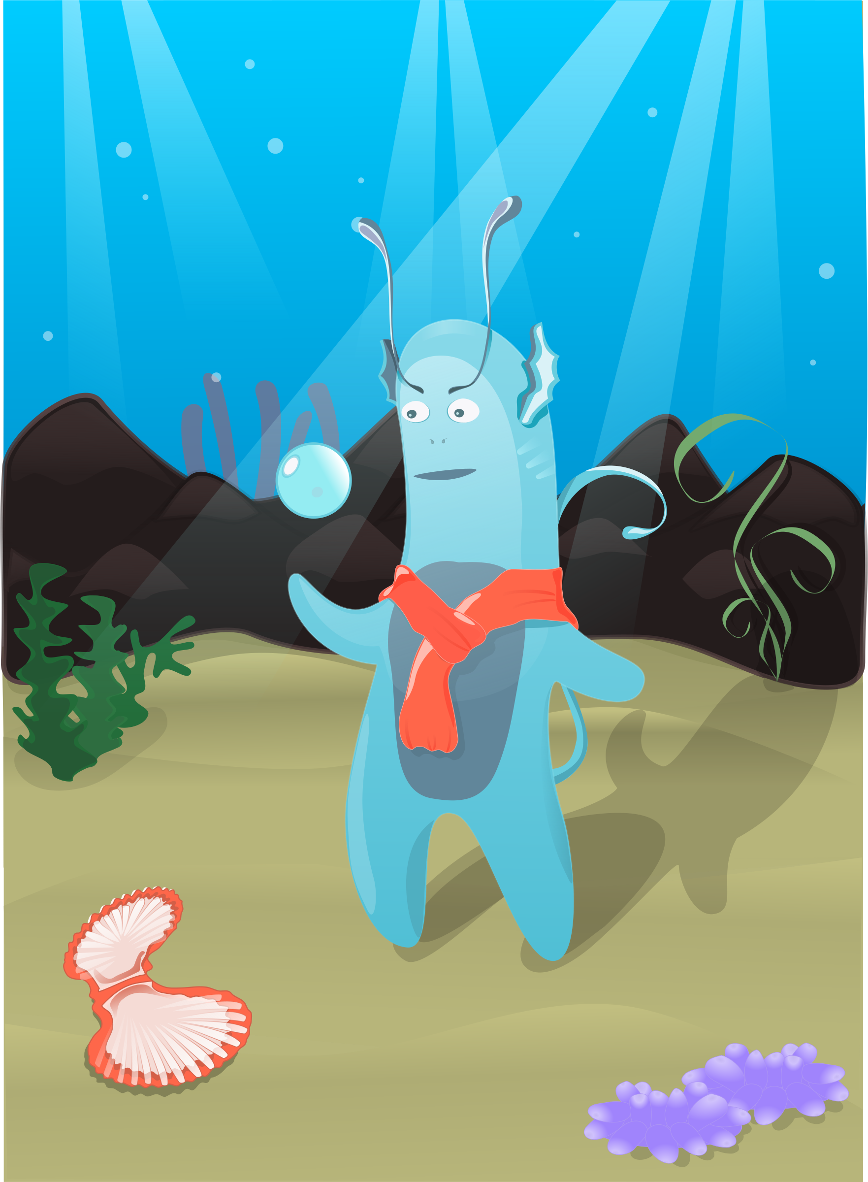 This features a cartoon-like blue creature standing on the ocean floor, holding a pearl in its hand. It appears to be an alien or sea monster character with a red scarf around its neck. The scene is set underwater, with various plants and shells scattered throughout the area. There are several other shells visible in the image, including one near the blue creature's foot and another on the ocean floor. Additionally, there are two pearls present in the scene, one held by the blue creature and another located further away from it.