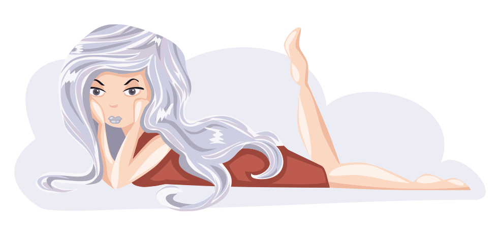This features a woman with light gray hair, wearing a burnt orange dress and laying on her stomach. She appears to be resting or relaxed in the scene. The background is filled with a light gray cloud, which adds an interesting element of depth to the illustration. Overall, it's a visually appealing image that captures the essence of a woman enjoying some downtime.