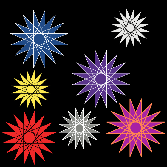 This features a collection of seven different colored stars, each with unique shapes and designs. They are arranged in a circular pattern, creating an eye-catching display. The stars vary in size and color, adding visual interest to the overall composition. The background is black, which helps to emphasize the vibrant colors and intricate patterns of the stars. This artistic arrangement can be used as a decorative element or for various creative purposes, such as wallpaper designs or digital illustrations.