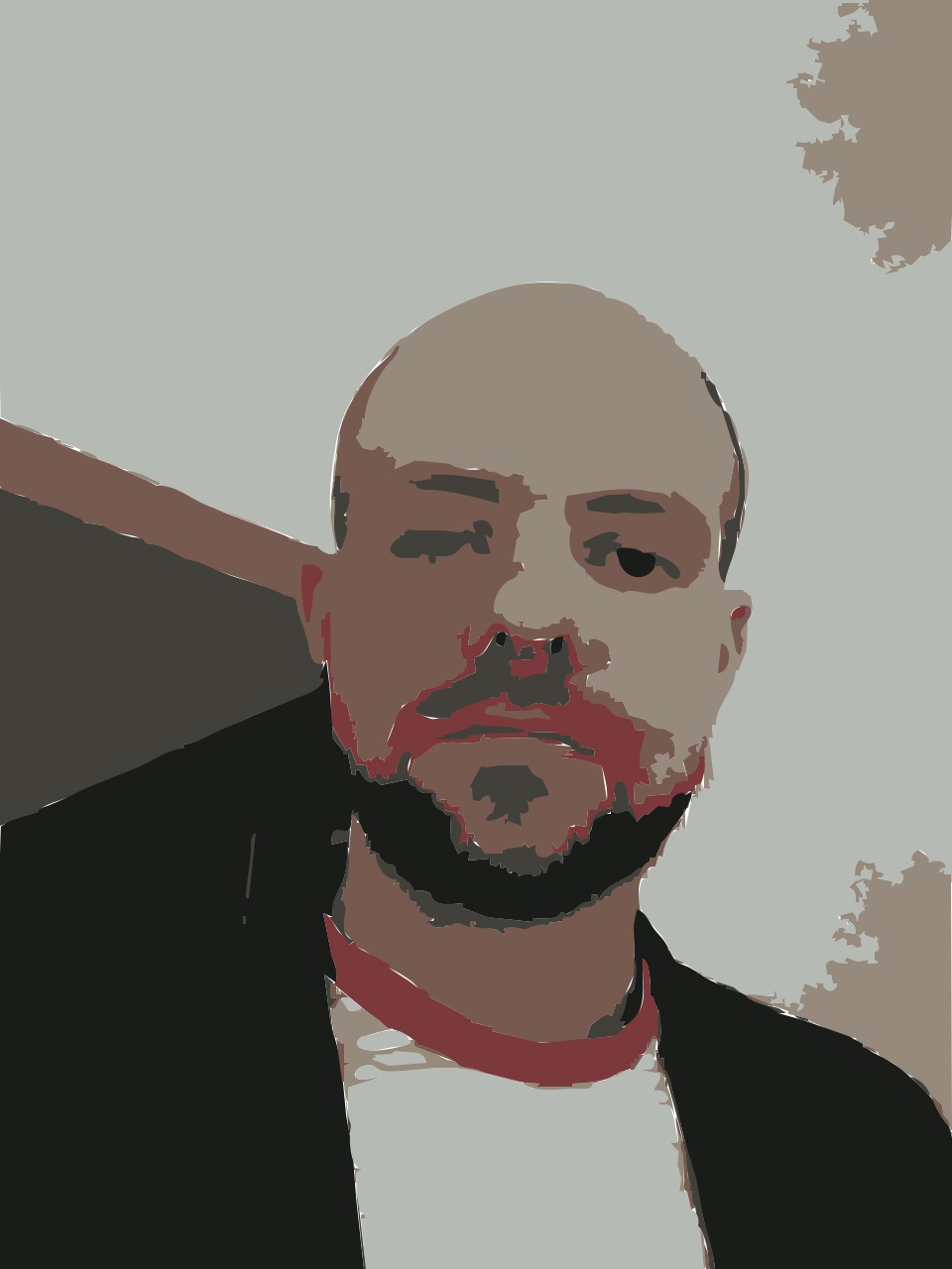 This features a man wearing a black jacket and a red shirt. He has a beard and is looking at the camera, possibly posing for a picture. His head appears to be slightly tilted as he looks into the lens of the camera. The man's attire suggests that he might be dressed up or going out for an event.