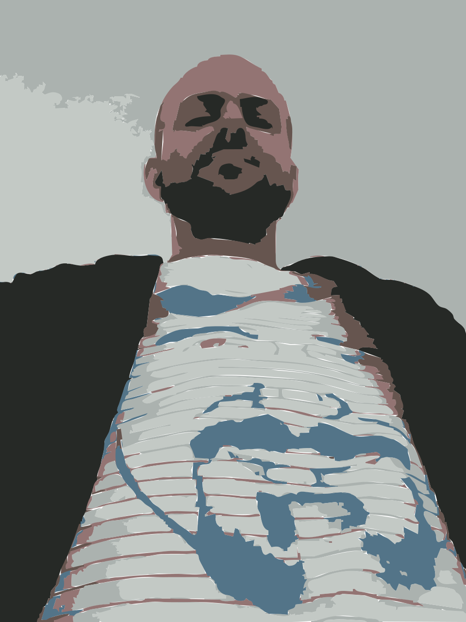 This features a man wearing a shirt with a face on it, standing in front of the camera. He is looking down towards the ground and appears to be staring at something off-camera. His facial expression seems somewhat serious or contemplative as he poses for the picture. The shirt's design adds an interesting visual element to the image, making it stand out from a typical photograph.