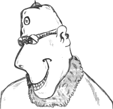 This features a man with glasses and a beard, wearing a hat. He is smiling and appears to have a scarf around his neck. The drawing of the man has an old-fashioned feel to it, giving it a vintage appearance. The man's facial expression suggests that he might be enjoying himself or having a good time.
