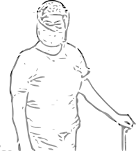 This features a man wearing a mask on his face, standing in front of a white background. He is holding a cane in one hand and a baseball bat in the other. The man appears to be dressed casually, with no visible clothing that would indicate any specific profession or activity. The overall scene gives off an artistic vibe, as it seems to be a black and white drawing of the man.