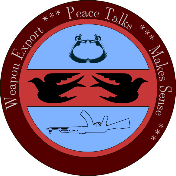 This features a circular design with the words "Peace Talks Export Makes Sense" written in the center. The outer edge of the circle is decorated with two birds, one on each side, and an arrow pointing upwards between them. In the middle of the circle, there are three guns arranged in a triangle formation, symbolizing the conflict that arises from exporting weapons. This design serves as a reminder of the importance of peace talks and the need to address the issue of weapon exports.