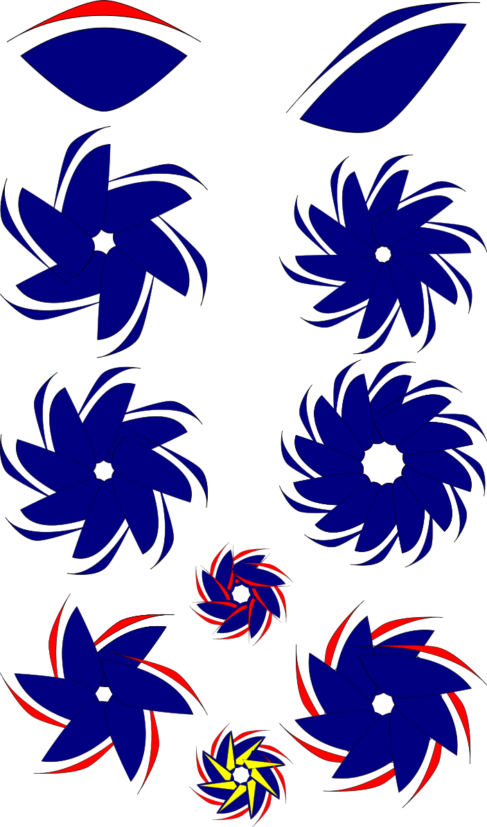 This features a collection of blue and red pinwheel designs. There are six distinct pinwheels in total, each with different shapes and sizes. Some of the pinwheels have a more rounded shape while others have a more angular appearance. These intricate designs create an eye-catching pattern that showcases the creativity behind them. The blue and red color scheme adds a vibrant touch to the overall composition, making it visually appealing and engaging for viewers.