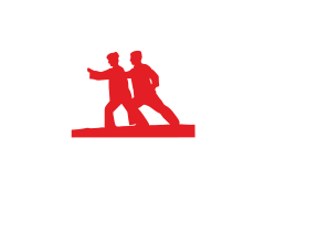 This features a red silhouette of two men standing next to each other, possibly engaged in some form of training or exercise. They are positioned on a red background that adds a vibrant touch to the scene. The overall composition of the image is simple yet visually appealing, with the focus being on the two figures and their connection through their shared activity.