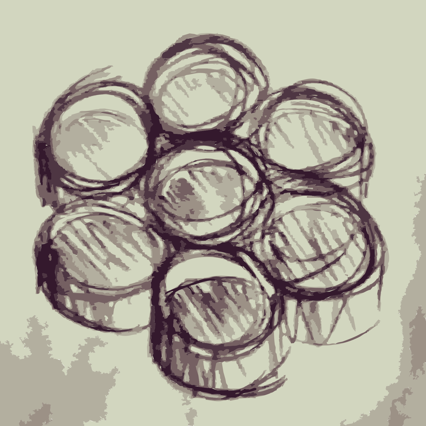 This is a hand-drawn sketch of an assortment of jars, lids and containers. There are six distinct objects in the drawing, each with different shapes and sizes. Some of these objects have lids on them, while others do not. The overall composition of the drawing gives off a sense of depth and complexity, as if it were a real-life arrangement of various jars and containers. The sketch is done in black and white, which adds to its artistic quality and emphasizes the contrast between light and shadow.