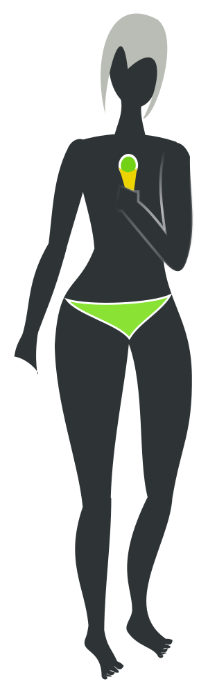 This features a woman with green bikini bottoms and a yellow ice cream cone in her hand. She is standing against a brown background, which contrasts nicely with the vibrant colors of her swimsuit and the ice cream cone. The woman appears to be enjoying her treat while posing for the picture.