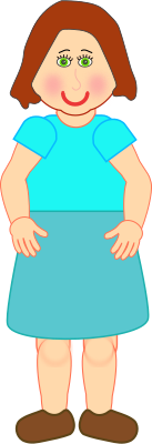 This features a cartoon drawing of a woman standing with her hands on her hips. She is wearing a blue dress and has a smile on her face, giving the impression that she is happy or playful. Her outfit includes a skirt, which adds to the overall appearance of the character. The woman's facial expression and attire suggest that she might be a cheerful or lighthearted individual.