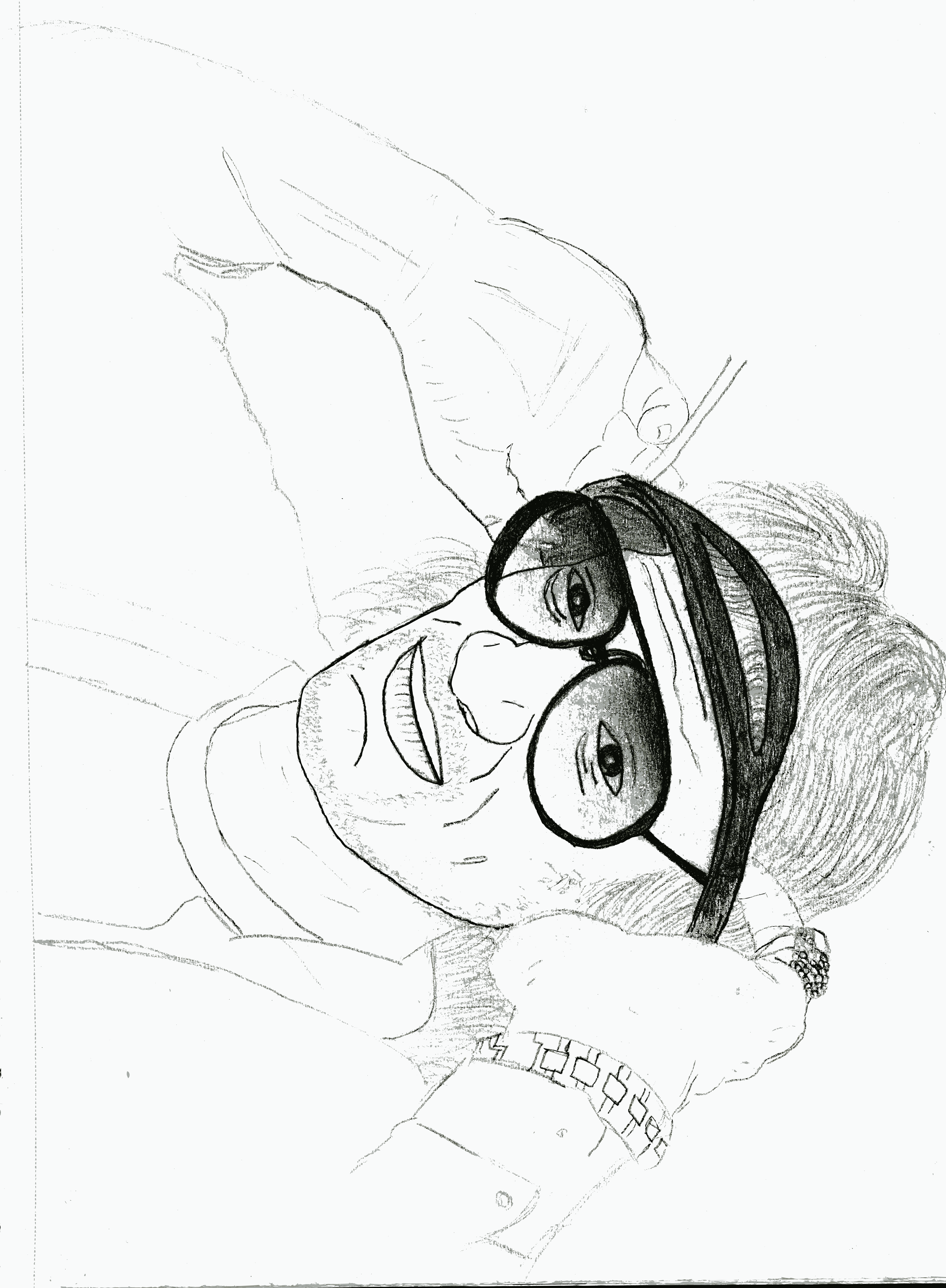 This is a black and white drawing of a person wearing sunglasses. The individual appears to be relaxed, possibly resting their head on their hand or arm. The sunglasses are placed over the top of the person's head, giving them an interesting appearance. The drawing captures the essence of the person and their casual demeanor.