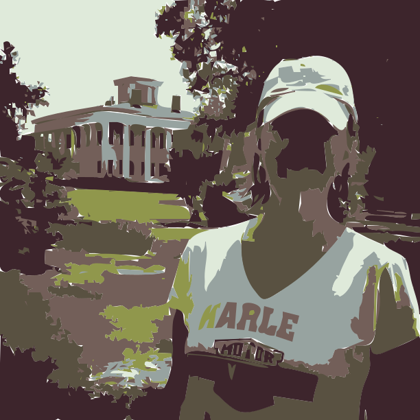 This features a woman wearing a white shirt and a white cap, standing in the grass near a building. She appears to be posing for a picture, with her face partially obscured by the sunlight. In the background, there is a large white building that adds an interesting architectural element to the scene. The woman's outfit suggests a casual and comfortable atmosphere, making it seem like a pleasant day outside.