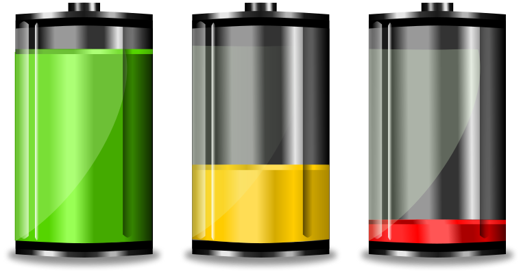This displays four different colored batteries, each with varying levels of charge. The first battery is a bright green and appears to be almost fully charged, while the second one is yellow and nearly half full. The third battery is red and has only a small amount of juice left in it, indicating that it's almost empty. Lastly, the fourth battery is black and seems to have no charge at all. These batteries are placed next to each other on a white background, making them stand out clearly against their surroundings.