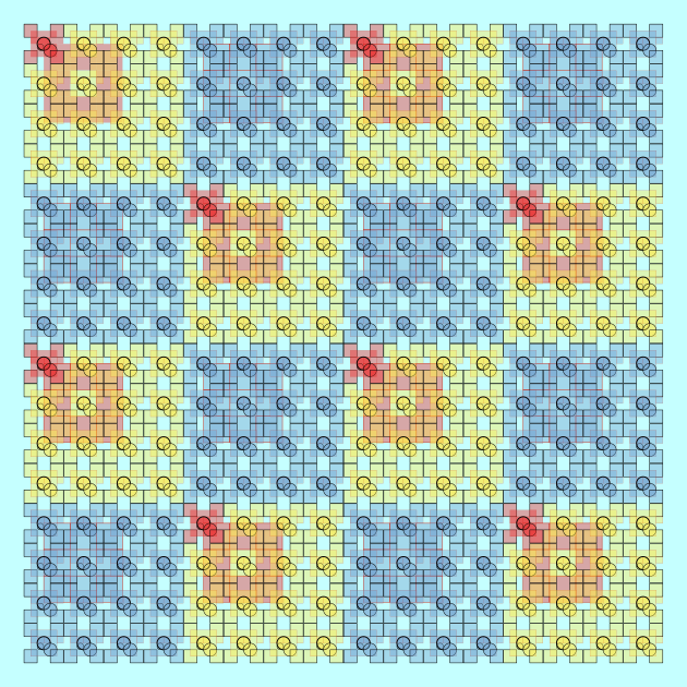 This features a blue and yellow checkered pattern with red squares. There are several blue squares in the pattern, some of which have yellow squares within them. Additionally, there are red squares that are placed throughout the entire pattern. This unique design creates an interesting visual effect as it combines different colors and shapes to create a cohesive yet distinctive pattern. The overall composition of the image is quite intriguing and captivating.