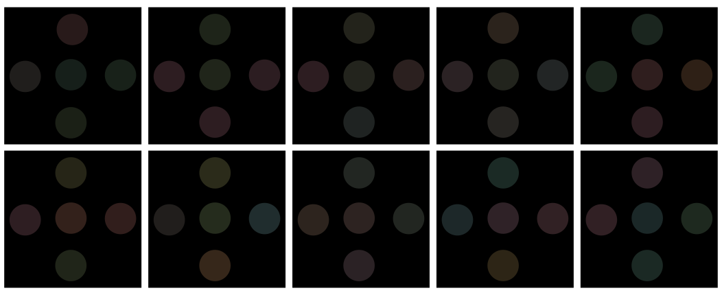 This is a collection of nine pictures, each featuring a square with circles on it. These squares are arranged in three rows and three columns, creating an organized display. Each circle within the squares has a different color, making the image visually appealing and engaging for viewers. This arrangement could be used as a color blind test or simply as an artistic presentation of various colors and shapes.