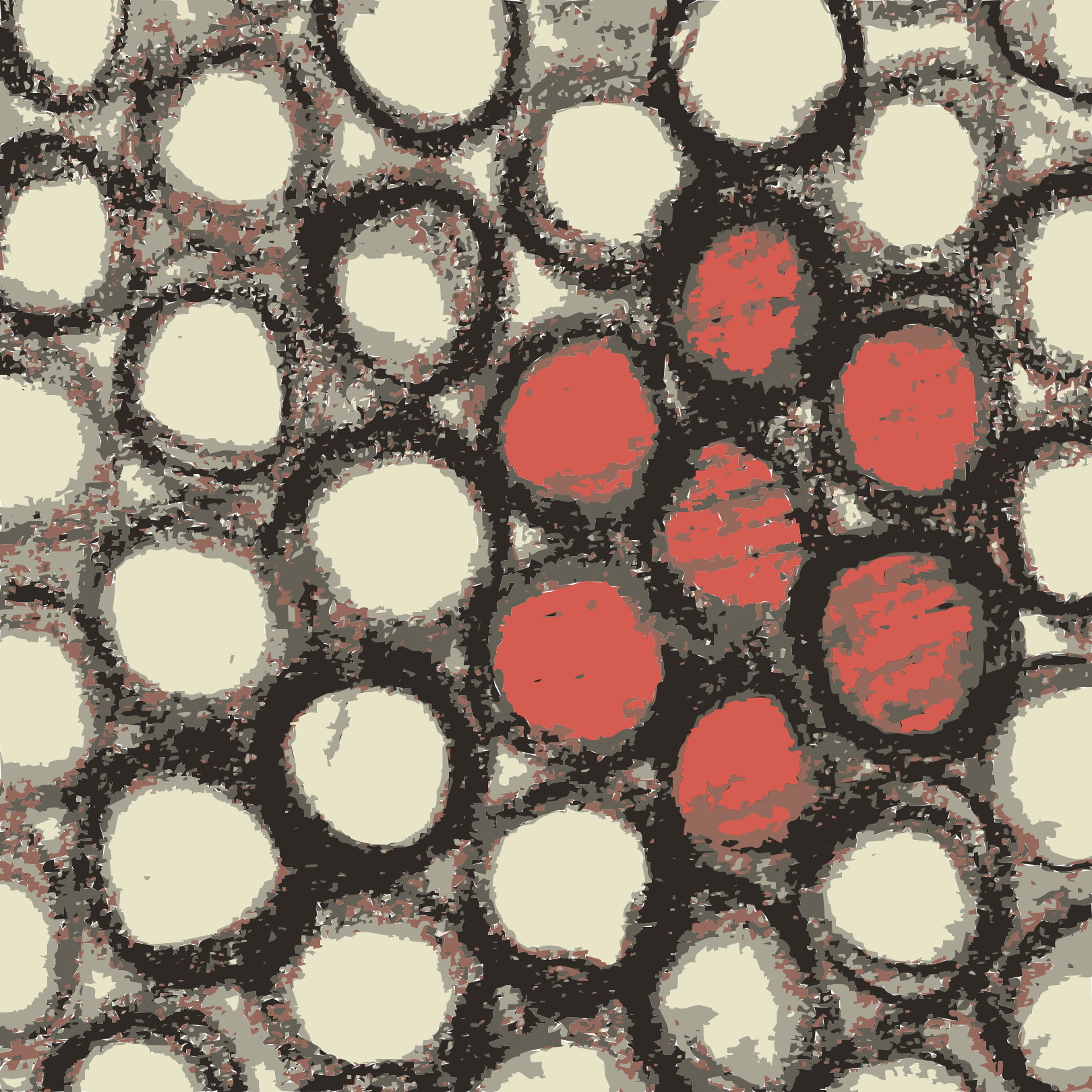 This features a close-up of a pattern made up of white and red circles, with the red circles forming a cluster in the center. The circles are outlined in black, giving them a distinct appearance. The overall composition creates an interesting visual effect that draws attention to the central area where the red circles gather. This artistic arrangement may evoke feelings of curiosity or intrigue for viewers who appreciate the contrast between the white and red colors, as well as the unique pattern created by the black outlines.